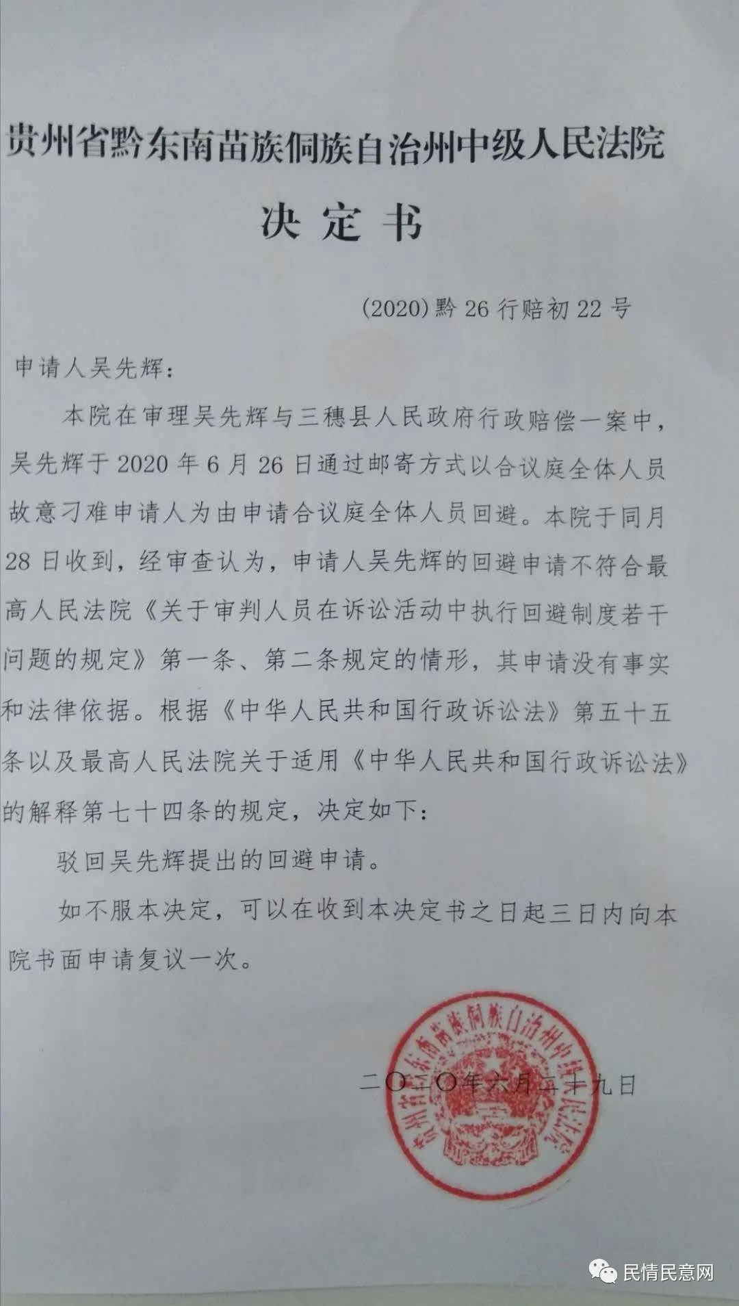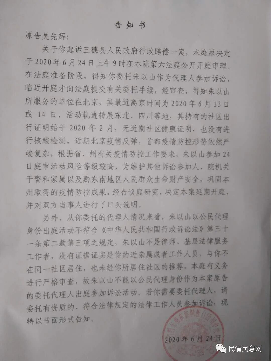 告知书 原告昊先辉: 关于你起诉三穗县人民政府行政赔偿一案,本庭原决定 于2020年6月24日上午9时在本院第六法庭公开开庭审理。 在法庭准备阶段,得知你委托朱以山作为代理人参加诉讼, 临近开庭才向法庭提交有关委托手续,经审查,得知朱以山 所服务的单位在北京,其最近离京时间为2020年6月13日 或14日,活动轨迹转展东北、四川等地,其持有的社区出 行证明始于2020年2月,无近期社区健康证明,也没有进 行核酸检测,近期北京疫情反弹,首都疫情防控形势依然严 峻复杂,根据省、州有关疫情防控工作要求,朱以山参加24 日庭审活动风险等级较高,为维护其他诉讼参加人、院机关 干警和家属以及黔东南地区人民群众生命财产安全,巩固本 州取得的疫情防控成果,经合议庭研究,决定本案延期开庭, 并对双方当事人进行了口头说明 另外,从你委托的代理人情况来看,朱以山以公民代理 身份出庭活动不符合《中华人民共和国行政诉讼法》第三十 条第二款第三项之规定,朱以山不是律师、基层法律服务 工作者,没有证据证实是你的近亲属或者工作人员,与你不 在同一社区居住,也未经你所居住社区的推荐,本庭有义务 进行严格审查,故朱以山不能以公民代理身份作为本案原告 的委托代理人出庭参加诉讼活动。若你需要委托代理人,请 委托有资质的、符合法律规定的法律工作人员参加诉讼,现 特以书面形式告知。 2020年6月24日