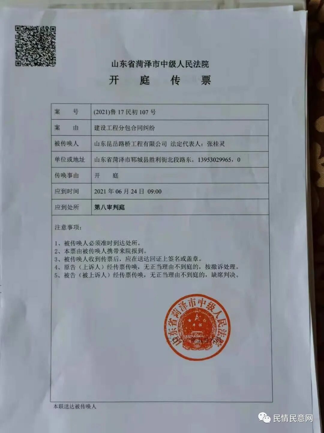 至今,已经有菏泽市交通运输局和郓城县交通运输局分别找到于目金了解情况,他们均没有对文章描写的事实提出任何异议,没有给付工程款,也没有给任何形式的书面说明和答复。
