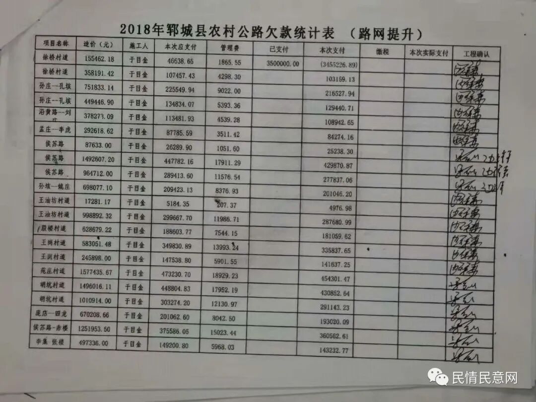 据于目金介绍,自己的公司现在是被拖欠工程款最多的公司,现在的菏泽中通工程有限公司郓城分公司和郓城县交通运输局,根本就不是没有钱,根本就不是平均都给百分之三,尽管部分修路资金被挪用,一些关系户和县领导的亲属朋友的公司和个人,都得到了自己应该得到的份额,某个县领导的司机,李局长的任兄弟,李局长的司机,税务局的领导的亲属朋友等等,他们给的款项都比较多。
